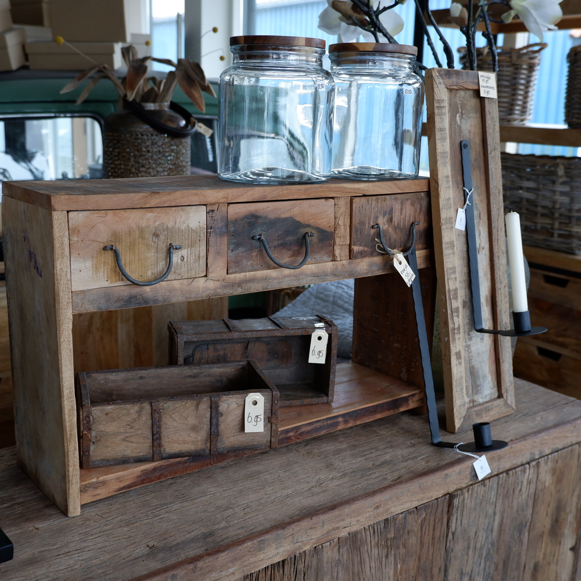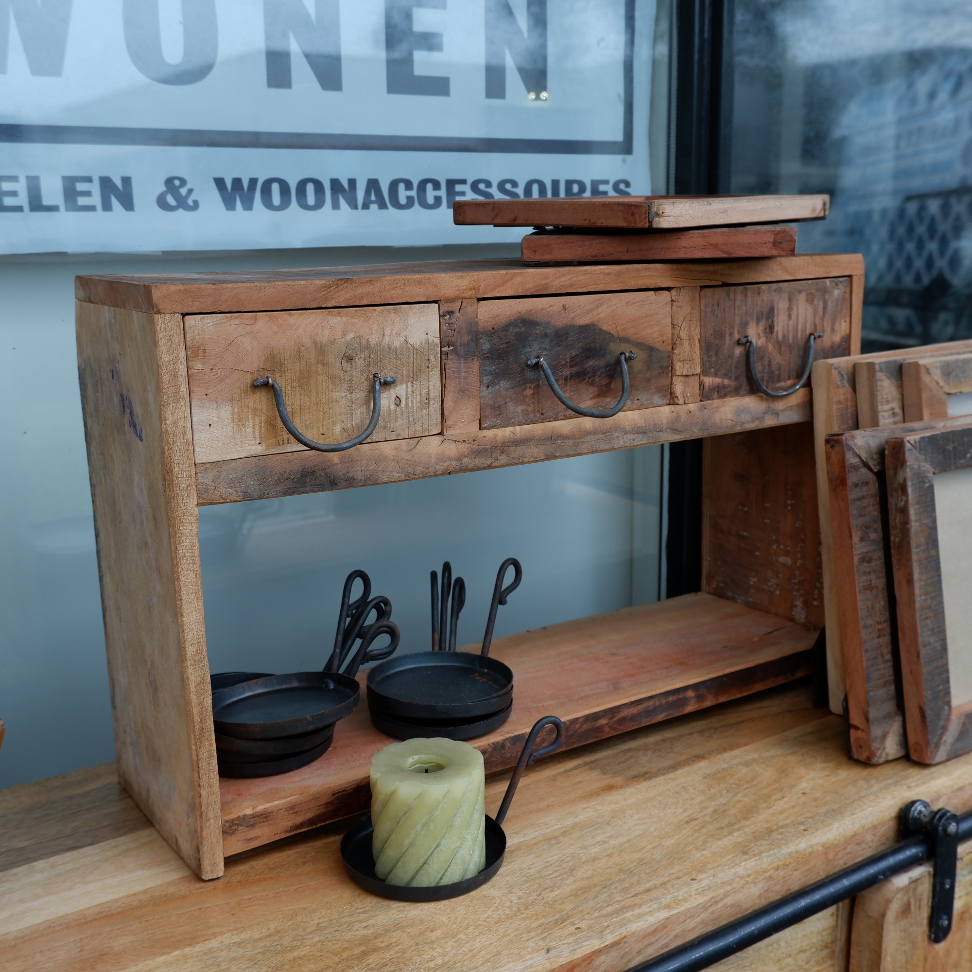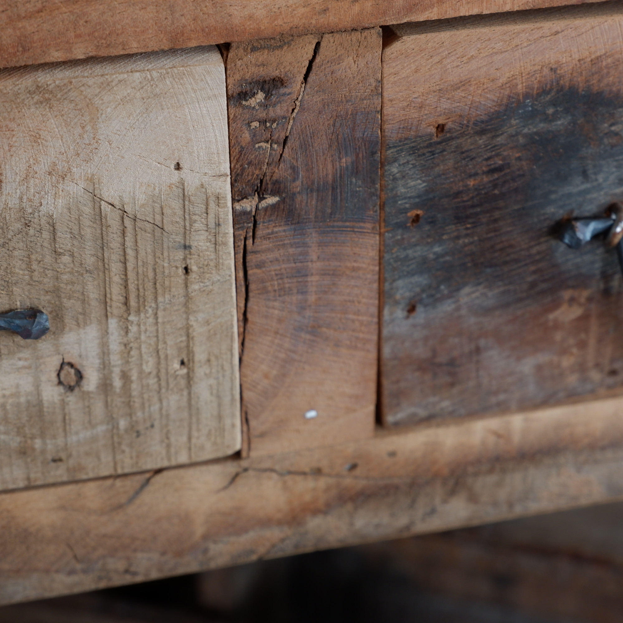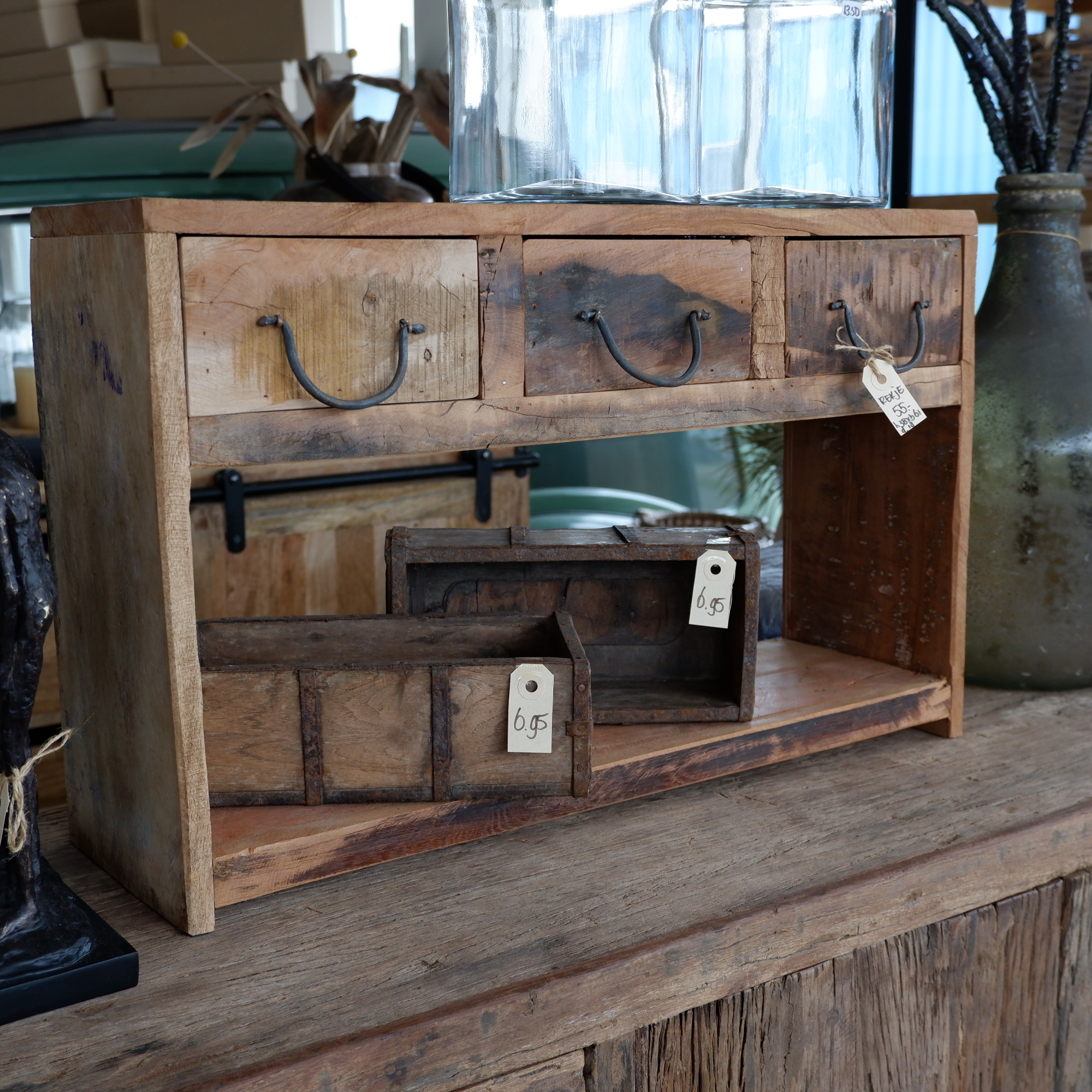 Het rek en lades zijn gemaakt van restanten oud hout van een vrachtwagenvloer