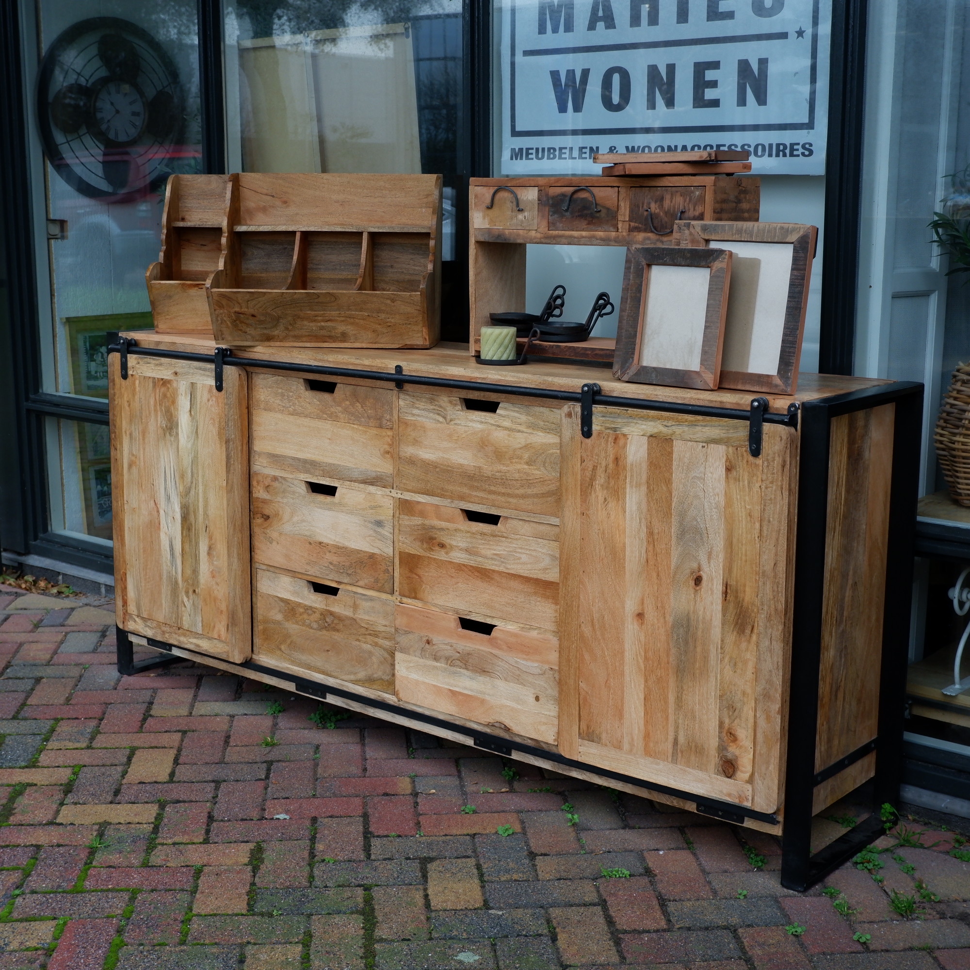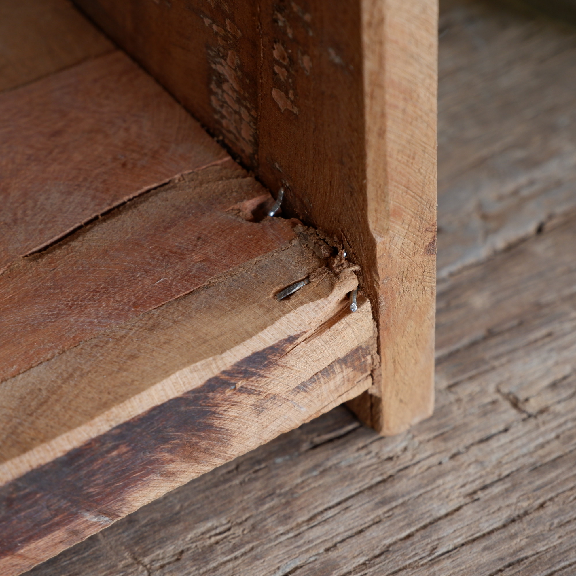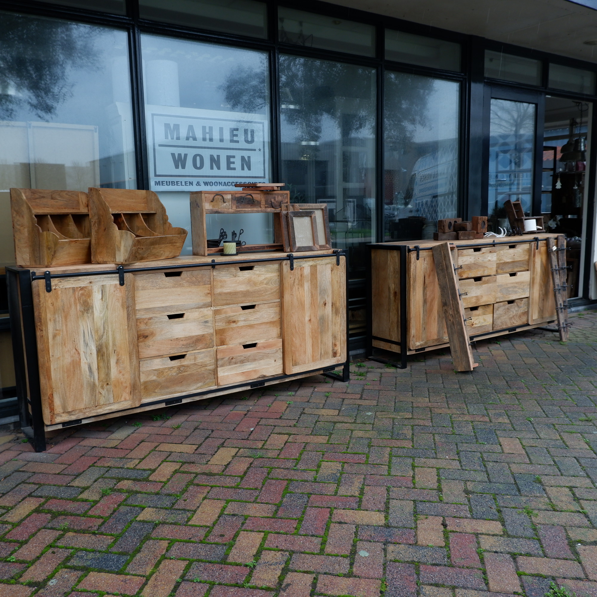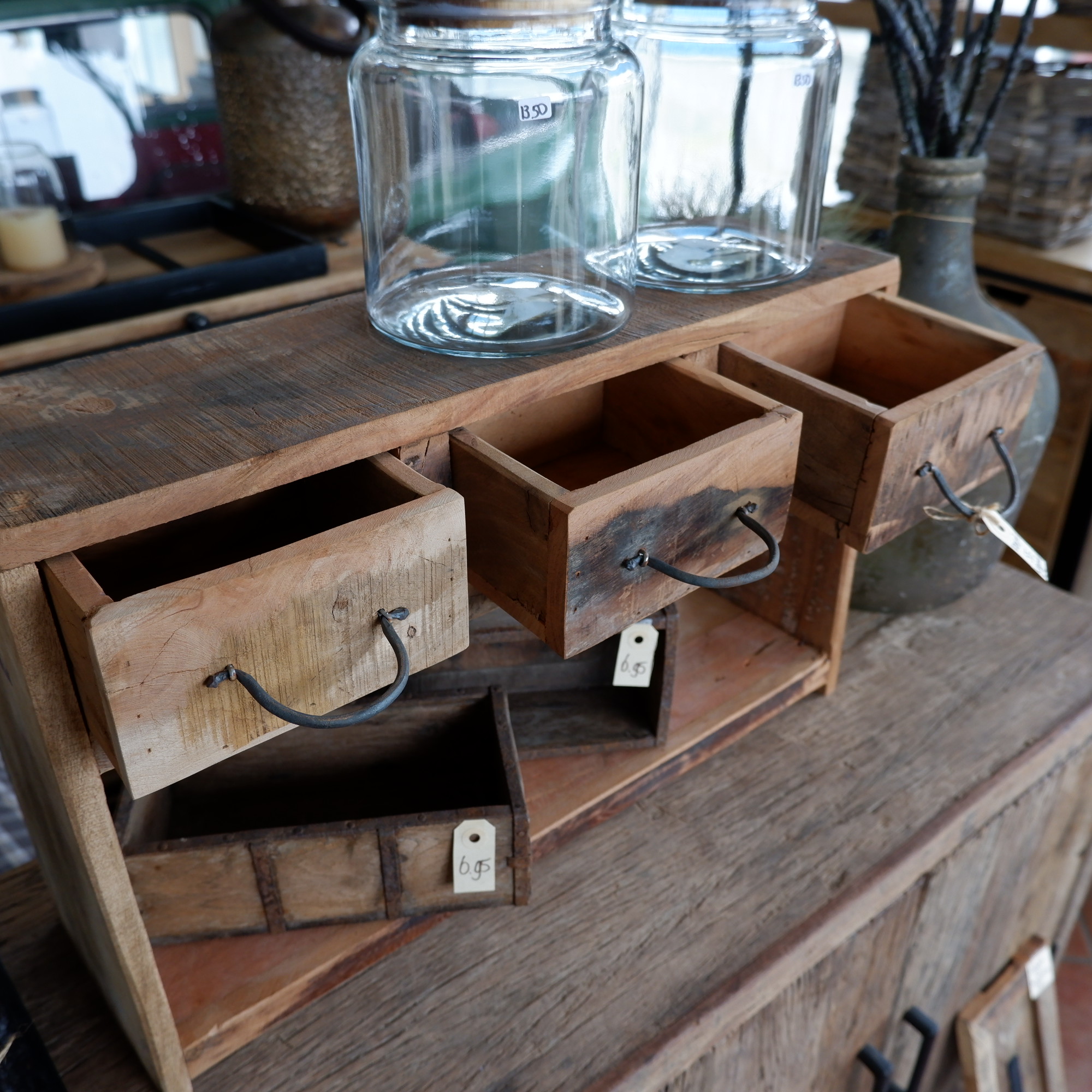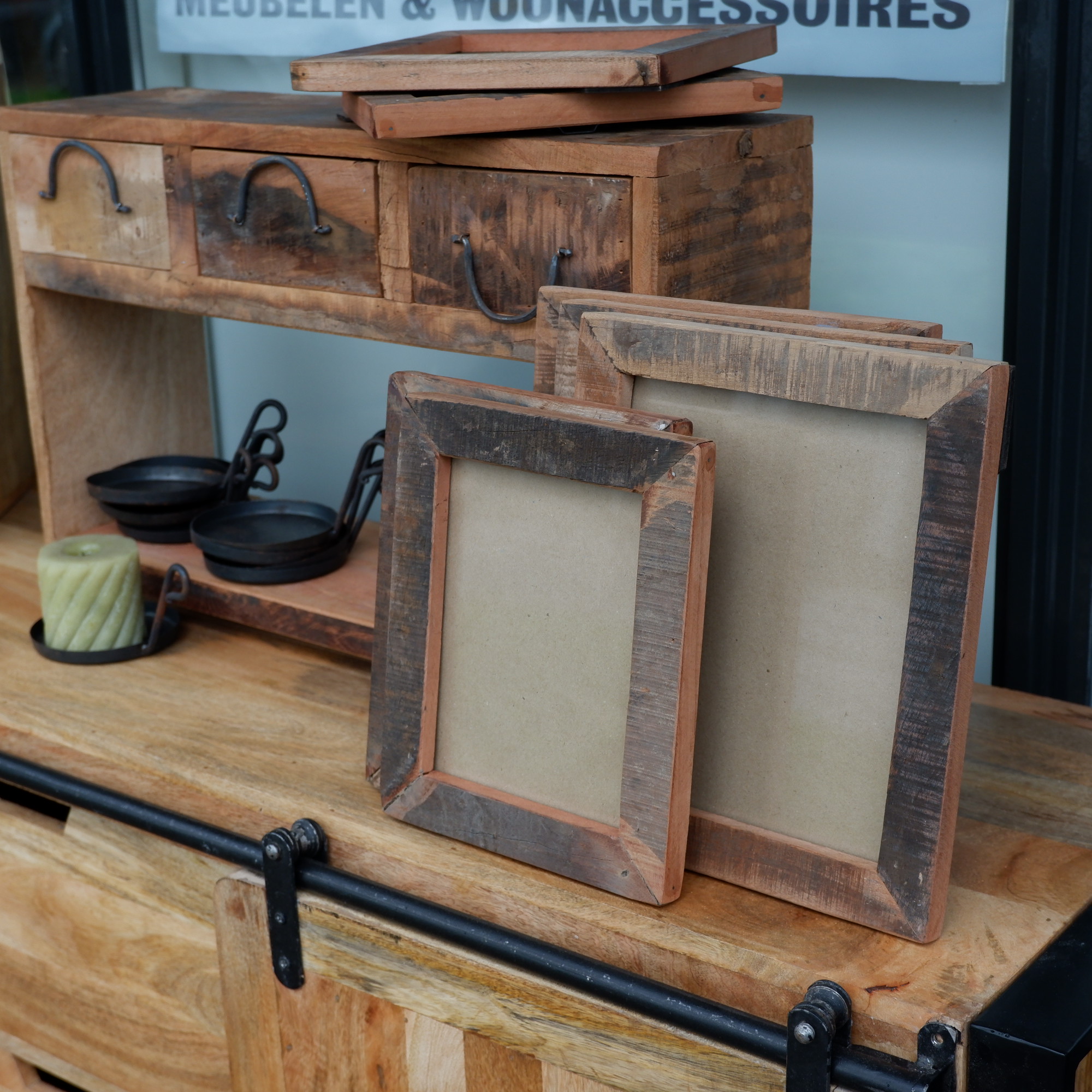 Het rek en lades zijn gemaakt van restanten oud hout van een vrachtwagenvloer